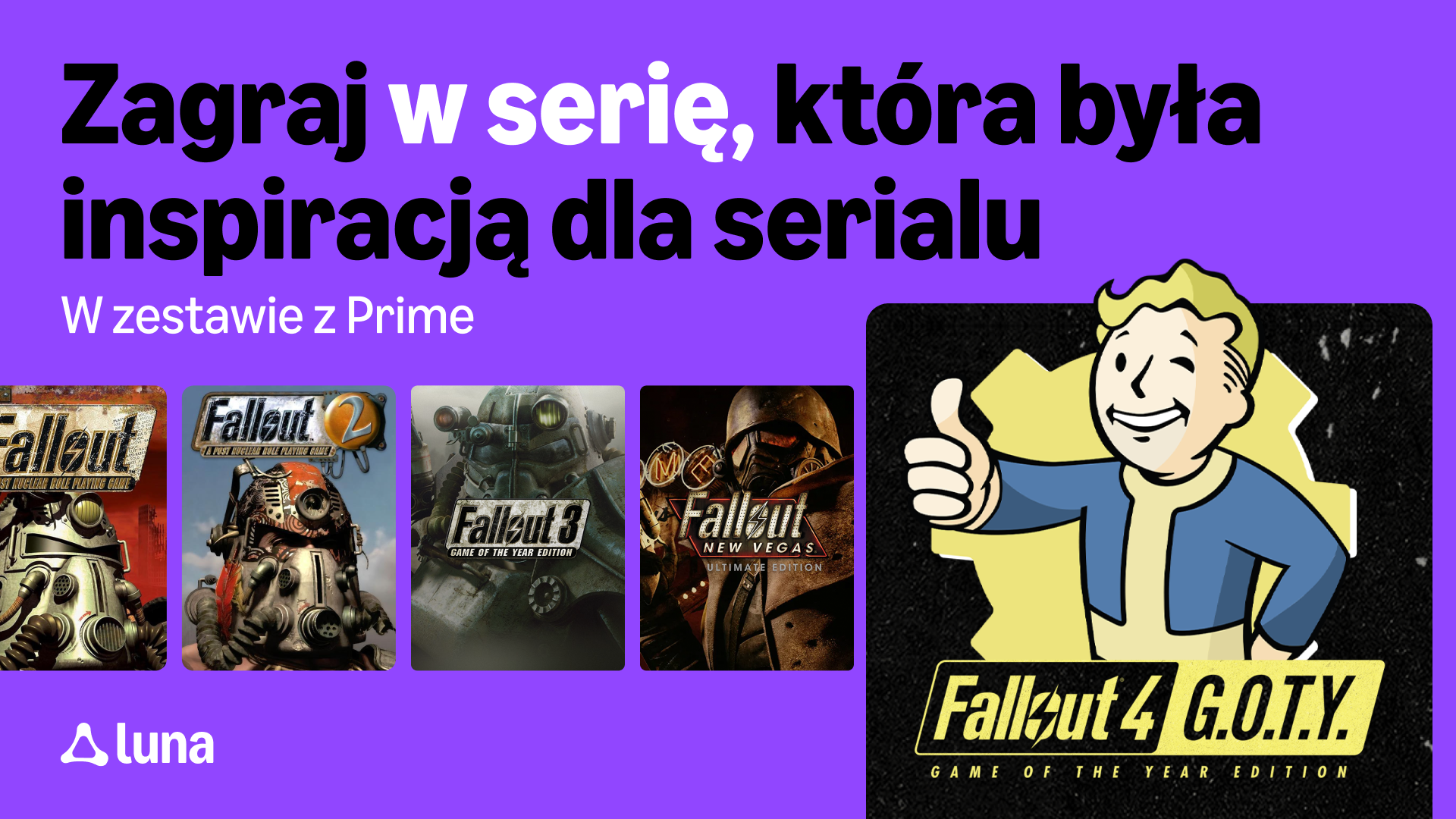 Gracze mogą już teraz wyruszyć w podróż przez Wspólnotę w grze Fallout 4: Game of the Year Edition, a od 23 grudnia będą mogli pobrać na PC grę, od której wszystko się zaczęło – Fallout: A Post Nuclear Role Playing Game– oraz wcielić się w Wybrańca w grze Fallout 2. Tytuły te dołączają do gier serii Fallout już dostępnych dla członków Prime: Fallout 3: Game of the Year Edition , w której gracze przemierzają Stołeczne Pustkowia, i wystawiającej szczęście na próbę Fallout: New Vegas Ultimate Edition. Ponadto od dziś gracze mogą wyruszyć w podróż przez Wspólnotę w grze Fallout 4: Game of the Year Edition.